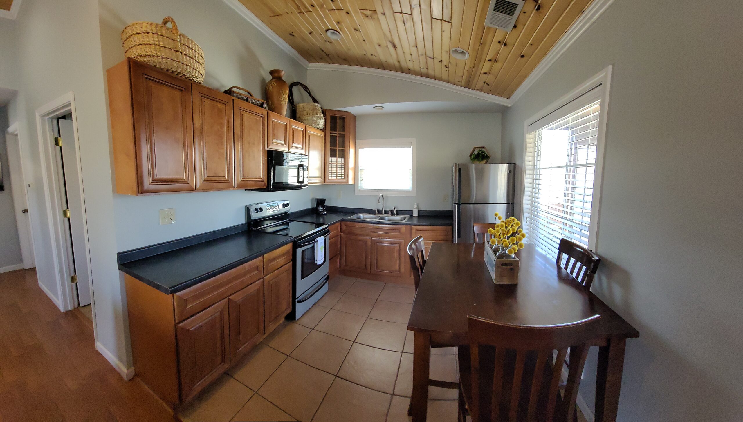 Indoor & outdoor seating, satellite TV, fireplace, full kitchen with appliances, two bedrooms (queen size beds, linens provided), full bath w/ tub, shower, towels & wash cloths; outdoor hot tub, fire pit, charcoal grill and a private five acre lake, fully stocked for fishing (see rental policies page for more info).